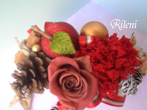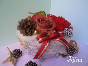 プリザーブド:ローズ、カーネーション アート:りんご その他:パール、ボール、リボン、 松かさ、シナモン